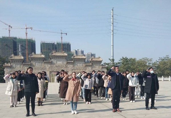 在广西革命烈士陵园纪念碑前,面对党旗,全体党员重温入党誓词。在庄严肃穆的气氛中,全体党员向烈士纪念碑鞠躬致敬,大家怀着沉痛的心情向伟大的革命烈士献花,深切缅怀并默哀,表达对革命烈士的崇敬和追思之情。