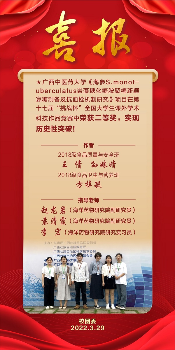 【喜讯】药学院学子荣获第十七届“挑战杯”二等奖,实现历史性突破! 作者:文/吴玉峰 发布时间:2022-03-30 16:54:15 浏览次数: 次 【字体:小 大】 近日,药学院学子王倩、孙姝婧、方梓毓代表鸭脖参加第十七届“挑战杯”全国大学生课外学术科技作品竞赛,凭借《海参S.monot-uberculatus岩藻糖化糖胺聚糖新颖寡糖制备及抗血栓机制研究》项目在大赛中荣获二等奖,实现历史性突破! 分享到: 【打印正文】