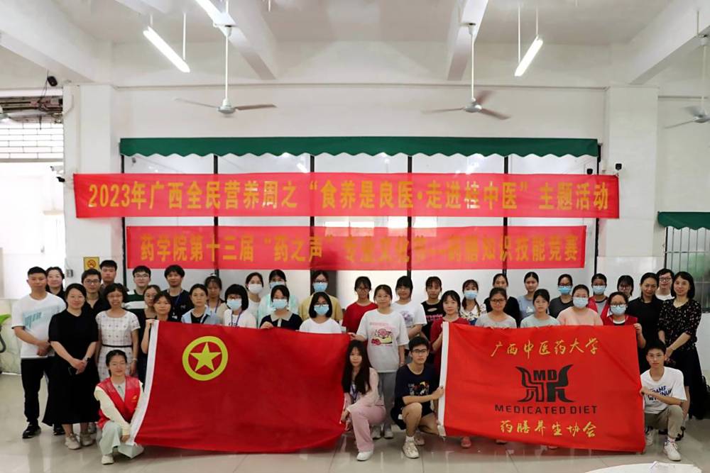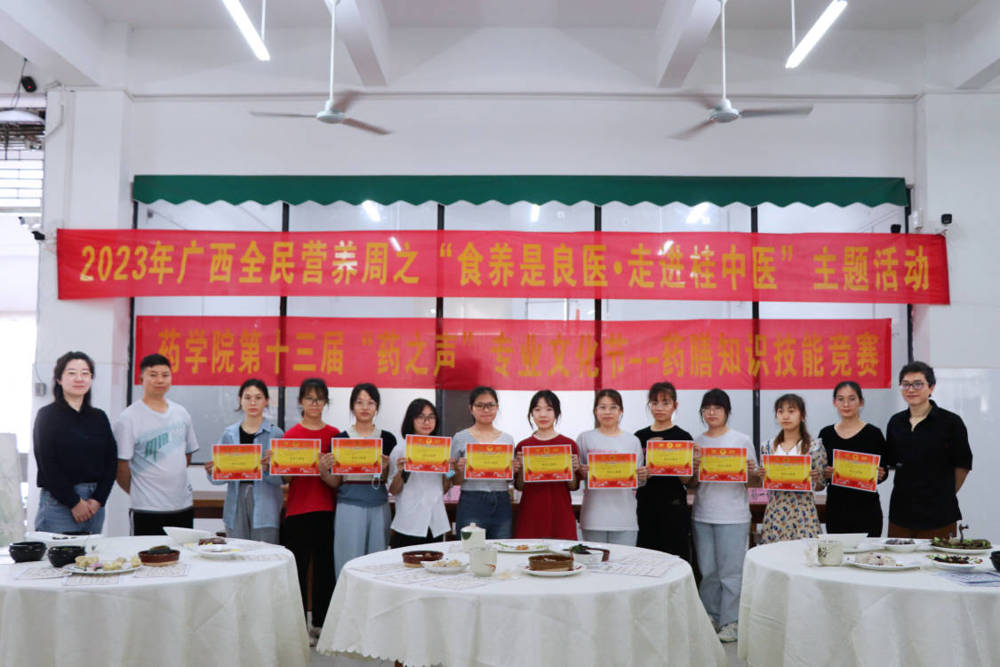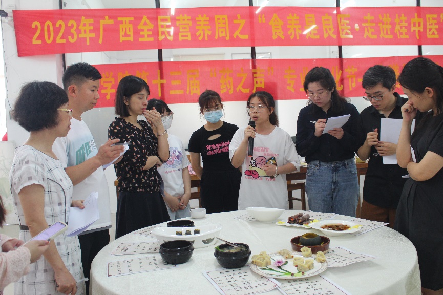 5月21日,药学院第十三届“药之声”专业文化节——药膳知识技能竞赛暨2023年广西全民营养周之“食养是良医•走进桂中医”主题活动于仙葫校区五合食堂落下帷幕。出席嘉宾有院党委李豫萍副书记、药学院团委黄鑫老师、食品科学系主任谭强教授、基础医学院学办杨丽琴主任、学校团委王雄将老师等。李豫萍副书记致辞希望参赛队员以药膳比赛为契机,加强中医药膳文化学习及推广应用,通过“以赛促教”、“以赛促学”普及中医传统食养知识与药膳技能,促进鸭脖各专业教育、思想政治教育与创新创业教育的深度融合。现场评审由易蔚教授、谢艳林主任、陈卫卫教授、周蓓教授、娄兵厨师长、孙一铭博士、陈豪博士组成。