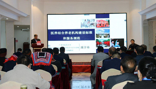 在学术讲座中,庞宇舟给大家做了《医养结合养老机构建设标准和服务规范》的讲座,瑶医药学院副院长李彤做了关于《YABO鸭脖瑶医药学院十年总结报告》。