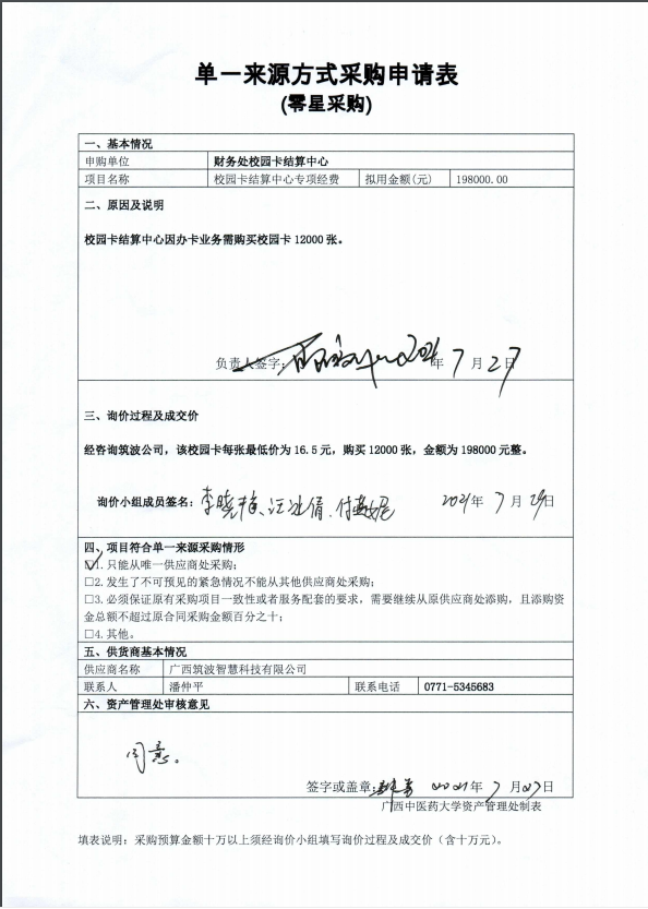 采用单一来源采购方式的原因及说明: 校园卡结算中心购校园卡是由唯一供应商(授权商)供应。