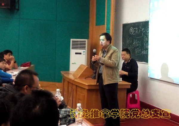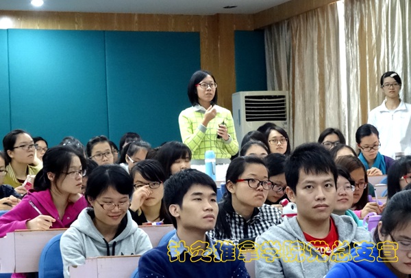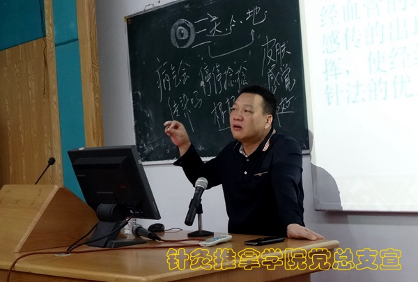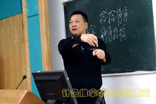 明秀校区西梯一教室,人头攒动,早已等候多时的学生把教室围了个水泄不通。9时正,范郁山教授讲座准时开场。他开宗明义以“广西针灸流派”的形成产生深远影响的朱琏老先生引入主题,接着讲述缓慢捻进针法的操作要点,范院长通过临床经验总结出的八大进针要素近、轻、直、稳、虚、慢、捻、停,精炼而精确,使广大师生们深受启发。进而,又依次介绍进针法的特点、经络与腧穴、现代研究经络的几个主要观点、各种针感的表现形式、如何掌握针感的量及如何调控针感,全方面地把缓慢捻进针法与针感的研究成果分享给大家,现场掌声不断,观众们受益匪浅。内容丰富的主讲结束后,由我院党委书记蒋闽义主持在场师生进入互动环节,同学们踊跃提出自己的问题并得到教授满意的答复,教授不仅为本次讲座内容答疑,还解开了一些同学们一直以来对中医和针灸的疑惑。最后讲座在雷动的掌声中结束。