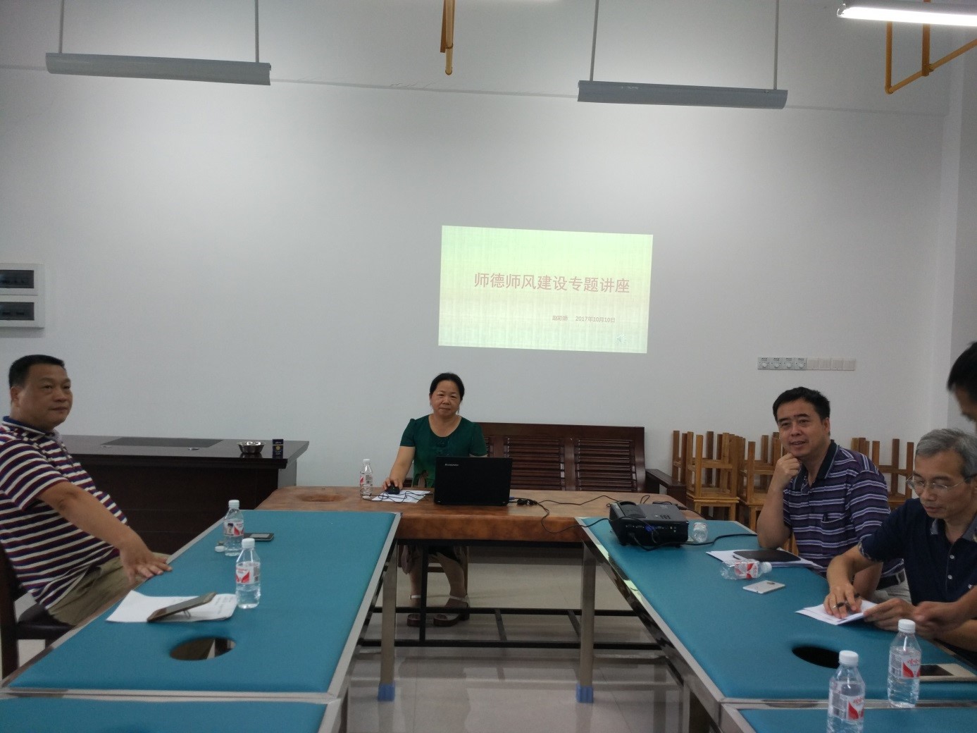 蒋书记提出加强师德师风建设是今年鸭脖的一项重要工作,全体教师要严格要求自己,结合教师职业道德行为规范“十不准”,不断提高学术水平和道德修养,做一名真正的“四有”教师。