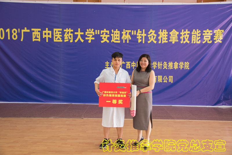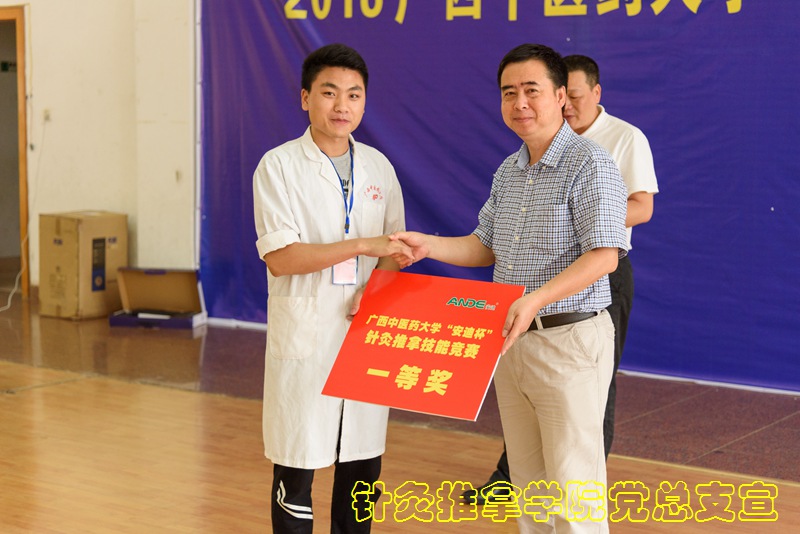 大赛最后,针灸推拿学院院长范郁山代表组委会对本次大赛进行了总结。针灸推拿学院领导老师、贵州安迪集团副总经理何顺莉女士为2018年“安迪杯”针灸推拿理论与技能竞赛获奖的集体和个人选手颁奖。