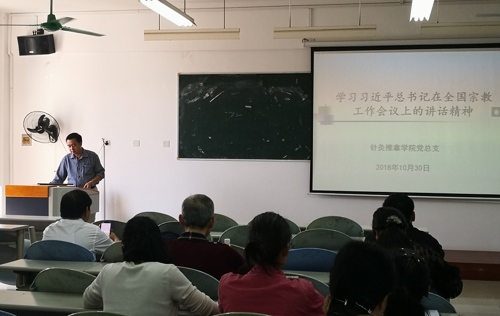 为了深入学习习近平总书记关于宗教工作的重要论述,针灸推拿学院于2018年10月30日下午在鸭脖明秀校区新西三教室召开了全院教职工学习大会,会议由院长范郁山主持。