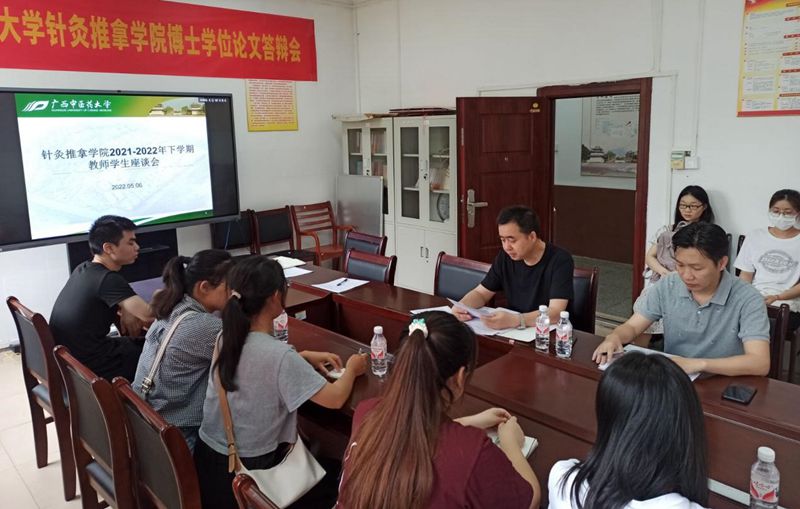 为推进学校质量文化建设,推进我院 “清廉桂中医”建设学风清新的目标。针灸推拿学院于 5 月 6 日下午在明秀校区学院会议室召开了教师学生座谈会,共同探讨“如何将‘五自’内化到意识、思想、行动当中,我为改善校风教风学风筹谋划策”。座谈会由学院党总支蒋闽义书记主持,学院辅导员和各班级学生代表参加了座谈会。