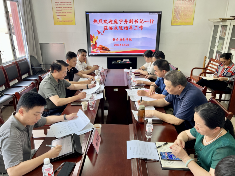 6月5日下午,学校党委副书记庞宇舟到针灸推拿学院进行调研指导工作,了解学院党总支在学习贯彻习近平新时代中国特色社会主义思想主题教育、本科教育教学审核评估、毕业生就业等工作进展情况。招生就业处辛华副处长、杨思源副处长陪同参加调研。