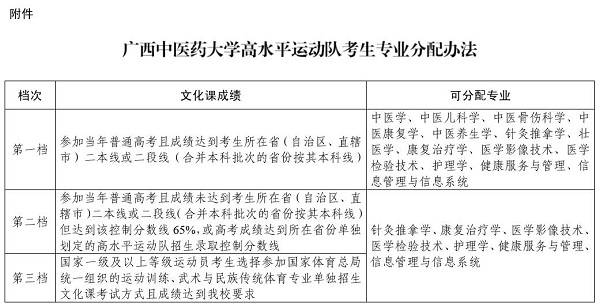 根据考生文化成绩将分配方案分为三档,每档可选专业以当年鸭脖高水平运动队招生简章公布为准,具体如下: