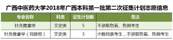 2018年征集志愿-广西本科第一批(第二次征集) 发布时间:2018-07-17 19:28:40 浏览次数: 次 【字体:小 大】 鸭脖此次将征集针灸推拿学,针灸推拿学(民族班)等专业计划共8名,详情如下: 征集志愿填报时间:7月18日18时至7月19日9时,请考生在规定时间内进入广西招生考试院官网(http://www.gxeea.cn)“2018年普通高校招生志愿填报”填报征集志愿,并保证在征集志愿填报、投档及录取期间保持报名时所留联系电话畅通。详情请点击“征集志愿”。 分享到: 【打印正文】