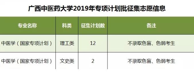 2019年征集志愿-专项计划批 发布时间:2019-07-10 10:23:12 浏览次数: 次 【字体:小 大】 鸭脖此次将征集考生14名,具体专业、名额如下: 征集志愿填报时间:7月10日18:00至7月11日9:00,请考生在规定时间内到广西招生考试院官网(http://www.gxeea.cn)进入“2019年普通高校招生志愿填报”填报征集志愿,并在录取期间保持报名时所留联系电话畅通。 详情请点击“征集志愿”。 分享到: 【打印正文】
