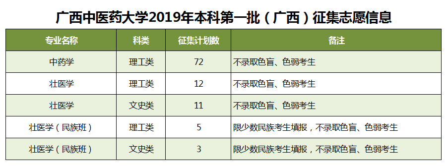 2019年征集志愿-本科第一批(广西) 发布时间:2019-07-14 10:28:37 浏览次数: 次 【字体:小 大】 鸭脖本次将征集中药学、壮医学、壮医学(民族班)等专业计划共103名,详情如下: 征集志愿填报时间:7月15日下午18:00至16日上午9:00,请考生在规定时间内到广西招生考试院官网(http://www.gxeea.cn)进入“2019年普通高等学校招生志愿填报”填报征集志愿,并在录取期间保持报名时所留联系电话畅通。 详情请点击“征集志愿”。 分享到: 【打印正文】