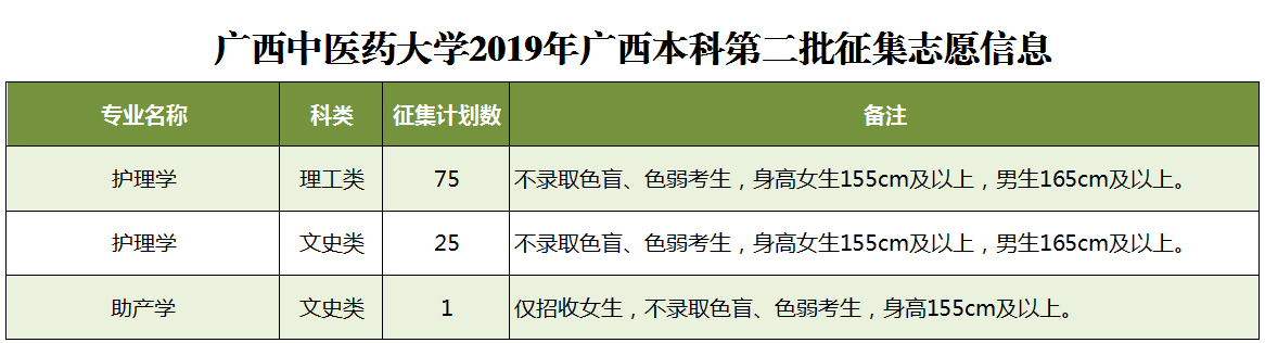 2019年征集志愿-广西本科第二批 发布时间:2019-07-25 10:44:13 浏览次数: 次 【字体:小 大】 鸭脖本次将征集护理学、助产学等专业计划共101名,详情如下: 征集志愿填报时间:7月25日下午18:30至26日上午9:00,请考生在规定时间内到广西招生考试院官网(http://www.gxeea.cn)进入“2019年普通高等学校招生志愿填报”填报征集志愿,并在录取期间保持报名时所留联系电话畅通。 详情请点击“征集志愿”。 分享到: 【打印正文】
