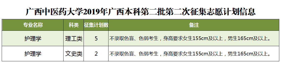 2019年征集志愿-广西本科第二批第二次征集 发布时间:2019-07-28 10:50:54 浏览次数: 次 【字体:小 大】 鸭脖本次将征集护理学专业计划共7名,详情如下: 征集志愿填报时间:7月28日下午18:00至29日上午9:00,请考生在规定时间内到广西招生考试院官网(http://www.gxeea.cn)进入“2019年普通高等学校招生志愿填报”填报征集志愿,并在录取期间保持报名时所留联系电话畅通。 详情请点击“征集志愿”。 分享到: 【打印正文】