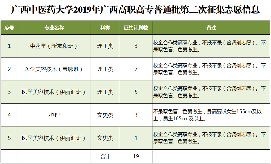 2019年征集志愿-广西高职高专普通批第二次 发布时间:2019-08-13 11:23:49 浏览次数: 次 【字体:小 大】 鸭脖本次将征集中药学(新友和班)等专业计划共19名,详情如下: 征集志愿填报时间:8月13日下午18:30至14日上午9:00,请考生在规定时间内到广西招生考试院官网(http://www.gxeea.cn)进入“2019年普通高等学校招生志愿填报”填报征集志愿,并在录取期间保持报名时所留联系电话畅通。 详情请点击“征集志愿”。 分享到: 【打印正文】