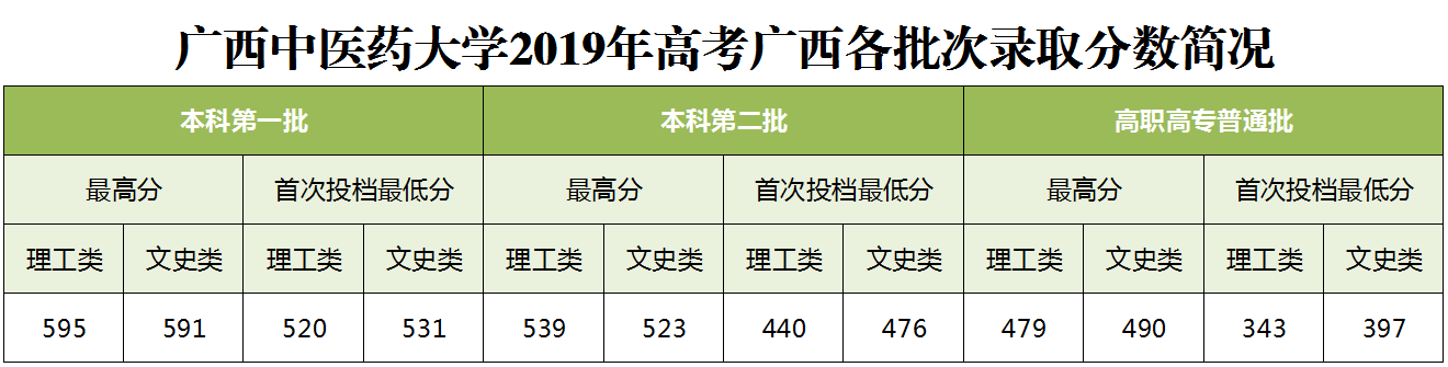 今年录取的考生中广西生源占比84%(1845人),区外生源占比16%(354人)广西本科考生(本科第一批、第二批、专项计划批)的本科第一批上线率达51.06%(816人),较2018年提高1.06%;高职高专考生(高职高专普通批)本科上线率达94.15%(660人),较2018年提高37.91%。生源质量继续稳步提升。各批次录取分数简况如下: