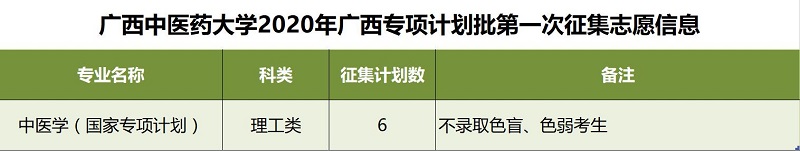 2020年征集志愿-专项计划批 发布时间:2020-08-13 11:24:16 浏览次数: 次 【字体:小 大】 鸭脖此次将征集缺额计划6名,具体如下: 征集志愿填报时间:2020年8月13日18:00至8月14日9:00,请考生到广西招生考试院官网(http://www.gxeea.cn)的首页“通知公告”和“普通高考-通知公告、招生信息”栏查询,在规定时间内进入“广西2020年普通高考招生志愿填报系统”填报征集志愿,并在录取期间保持报名时所留联系电话畅通。 详情请点击“征集志愿”。 分享到: 【打印正文】