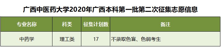 2020年征集志愿-广西本科第一批第二次征集 发布时间:2020-08-22 18:05:35 浏览次数: 次 【字体:小 大】 鸭脖本次将征集中药学专业计划17名,详情如下: 征集志愿填报时间:2020年8月22日18:30至8月23日9:00,请考生到广西招生考试院官网(https://www.gxeea.cn)的“普通高考-通知公告、招生信息”栏查询,在规定时间内进入“广西2020年普通高考招生志愿填报系统”填报征集志愿,并在录取期间保持报名时所留联系电话畅通。 详情请点击“征集志愿”。 分享到: 【打印正文】