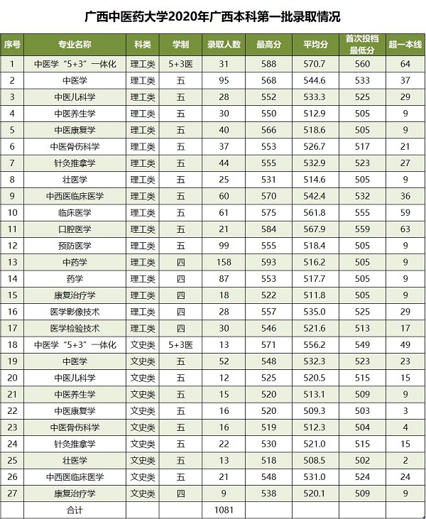 2020年,鸭脖在广西本科第一批共录取考生1081人,其中,文史类189人,理工类892人。按原计划顺利完成了该批次的录取任务,详情如下: