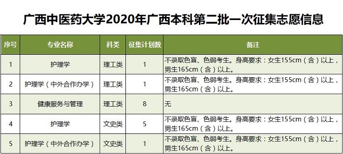 2020年征集志愿-广西本科第二批第一次征集 发布时间:2020-08-27 18:01:09 浏览次数: 次 【字体:小 大】 鸭脖本次将征集护理学(含中外合作办学)、健康服务与管理专业计划16名,详情如下: 征集志愿填报时间:2020年8月28日18:30至8月29日9:00,请考生到广西招生考试院官网(https://www.gxeea.cn)的“普通高考-通知公告、招生信息”栏查询,在规定时间内进入“广西2020年普通高考招生志愿填报系统”填报征集志愿,并在录取期间保持报名时所留联系电话畅通。 详情请点击“征集志愿”。 分享到: 【打印正文】