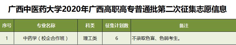 2020年征集志愿-广西高职高专普通批第二次征集 发布时间:2020-09-16 17:59:10 浏览次数: 次 【字体:小 大】 鸭脖本次将征集中药学(校企合作班)专业缺额计划6名,详情如下: 征集志愿填报时间:2020年9月16日18:30至9月17日9:00,请考生到广西招生考试院官网(https://www.gxeea.cn)的“普通高考-通知公告、招生信息”栏查询,在规定时间内进入“广西2020年普通高考招生志愿填报系统”填报征集志愿,并在录取期间保持报名时所留联系电话畅通。 详情请点击“征集志愿”。 分享到: 【打印正文】