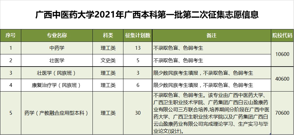 鸭脖本次将征集中药学、壮医学、壮医学(民族班)、康复治疗学(民族班)、药学(产教融合应用型本科)专业计划共58名,详情如下: