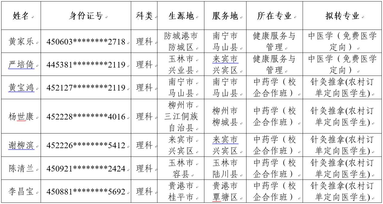根据自治区卫健委、教育厅、中医药局联合下发的《关于全面落实2021年农村订单定向医学生免费培养招录任务的通知》以及鸭脖《关于全面完成2021年农村订单定向医学生免费培养招生任务的通知》等文件精神,结合学生报名情况,拟将2021级黄家乐等2名同学的录取专业调剂为本科中医学(免费医学定向)专业,拟将杨世康等5名同学的录取专业调剂为高职针灸推拿(农村订单定向医学生)专业,现将名单公示如下: