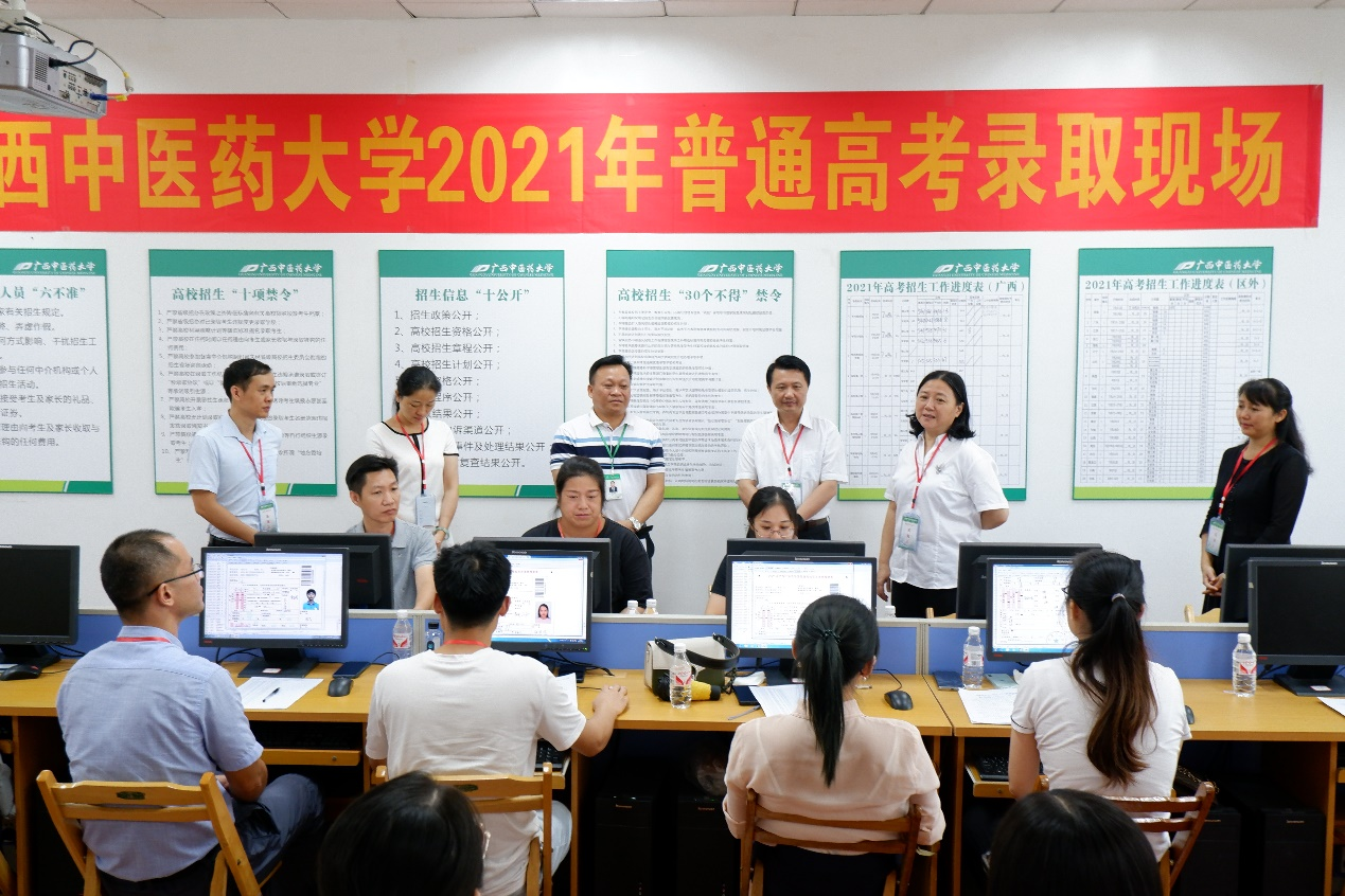 7月17日上午,鸭脖校长姚春、党委副书记庞宇舟一行在校办副主任蓝开宝、纪委副书记韦海英、教务处长莫雪妮、学工处副处长吴健文的陪同下到明秀校区2021年高考招生录取现场指导招生工作。