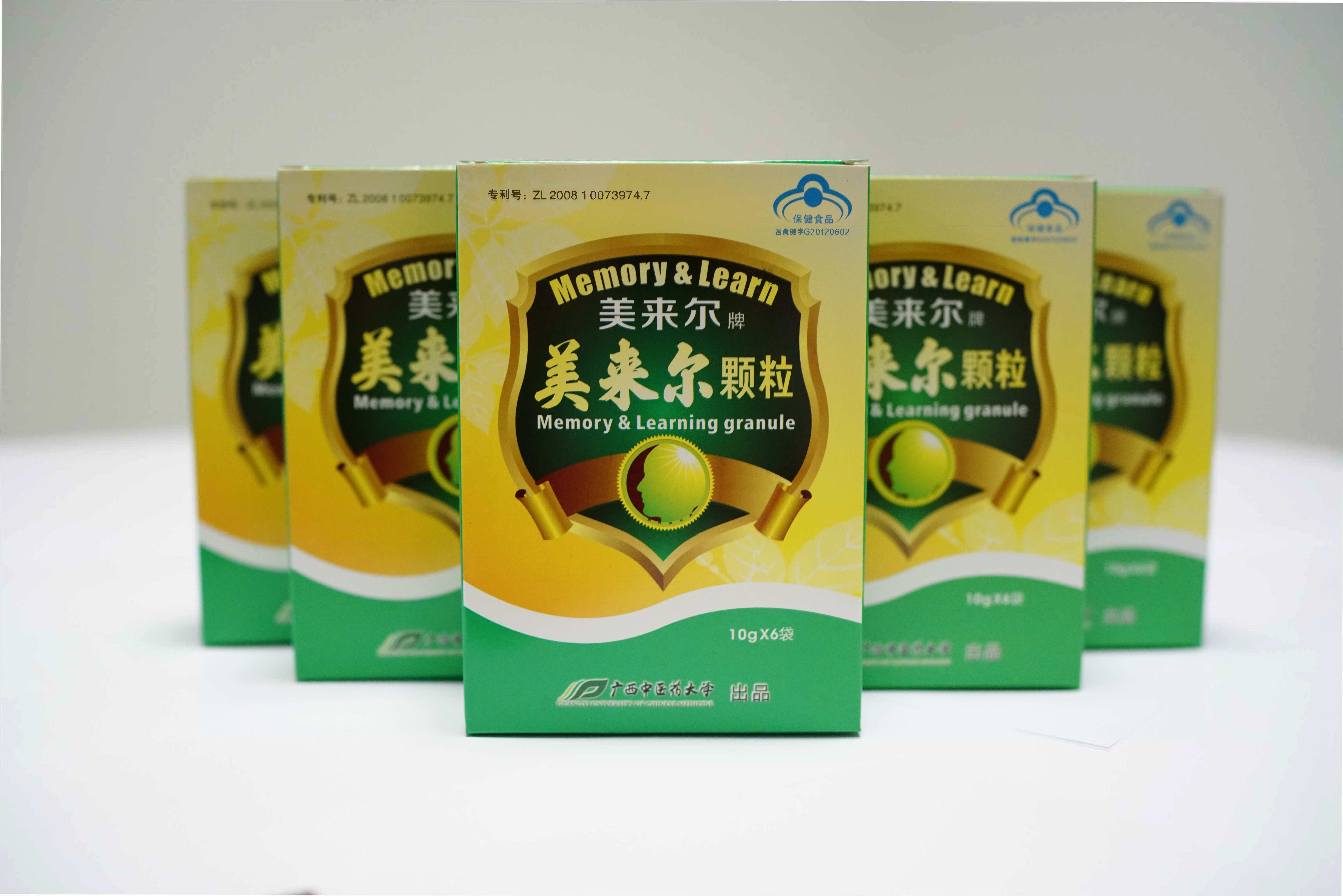 美来尔牌益智颗粒的研究自先后获国家科技部、广西科技厅等政府部门5项科研项目的资助,同时获得中泰两国政府批准的国际合作项目。近年来,重点实验室成员在传统中医药理论的指导下,应用现代制剂学、药理学及生物医学等科学技术方法开展了系统的研究,自主成功研发出国家级健康养老保健食品。本产品已获国家食品药品监督管理局颁发的“国产保健食品批准证书”(国食健字G20120602),获2项中国发明专利,1项国际发明专利,为完全原创知识产权的健康产品。2016年该产品已成功转让广西邦琪药业。