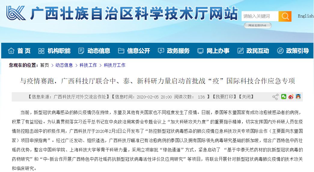为快速响应和落实中央及自治区党委、政府对新型冠状病毒感染的肺炎疫情联防联控工作的决策部署,联合东盟及有关国家科研力量共同开展科研攻关和协同研究,为遏制疫情蔓延势头提供科技支撑,广西科技厅率先启动“防控新型冠状病毒感染肺炎疫情应急科技攻关专项国际合作(主要面向东盟国家)项目申报工作”。实验室主任邓家刚教授牵头的项目组联合新加坡国立大学申请的“中-新合作开展广西特色中药壮瑶药抗新型冠状病毒活性评价及应用研究”,实验室常务副主任郝二伟研究员牵头的项目组参与申请的“基于中泰天然药材的抗新型冠状病毒的药物研究”,分别获得广西科技厅首批战“疫”国际科技合作应急专项资助。