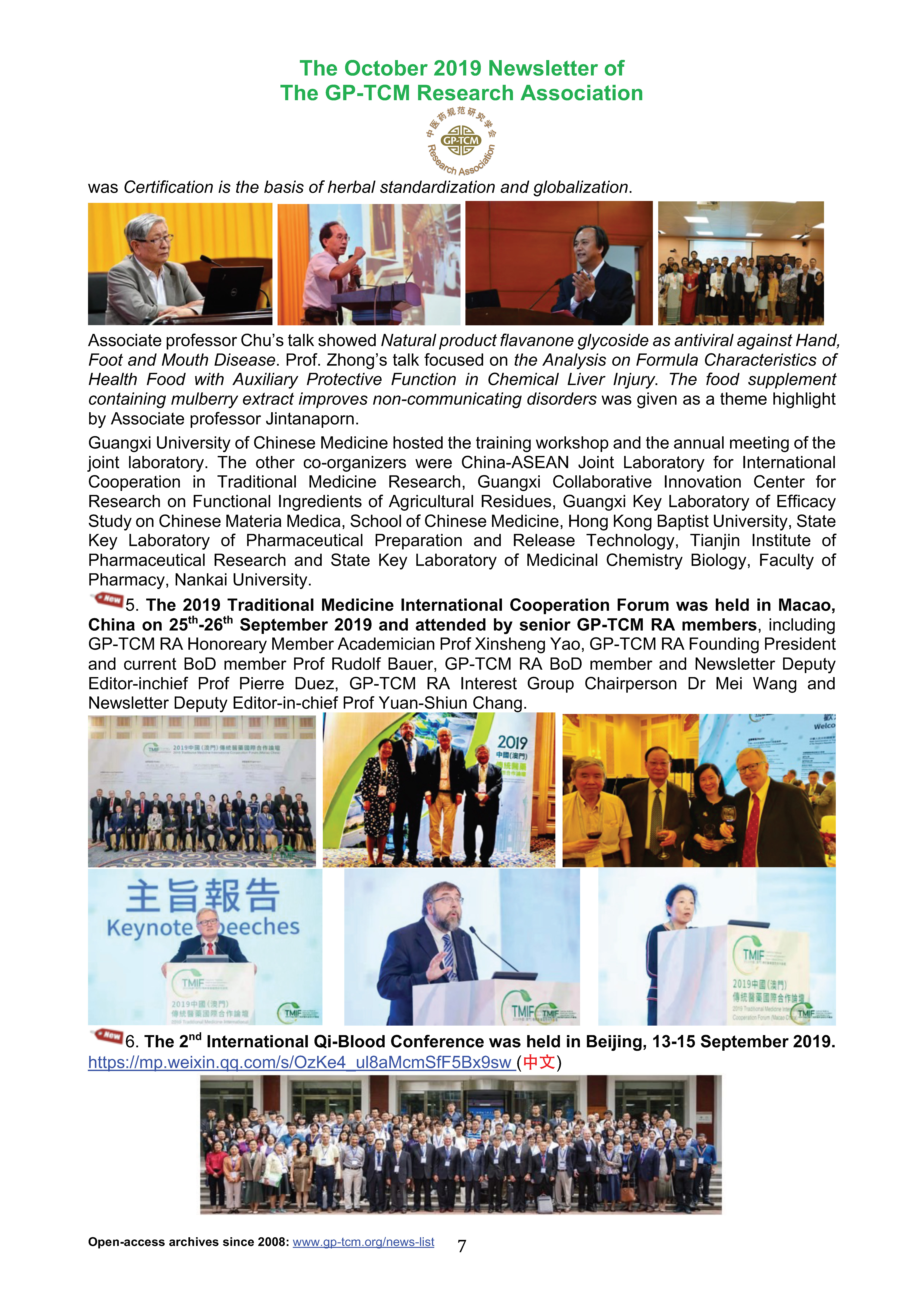 2019年10月,《中医药规范化研究学会》(GP-TCM)杂志刊登报道了第三届中国--东盟传统药物与农作物废弃物药用研究技术培训班(The 3rd China-ASEAN Training Workshop for Medicinal Study on Traditional Medicine)成功举办。