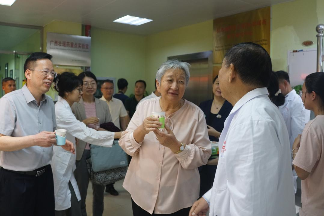 朱华教授向朱兆云院士简要介绍了壮瑶药重点实验室的基本情况,展示了壮瑶药理论和实践研究成果、平台获得的科技奖项、中药壮瑶药资源普查标本库、实验室产品兰香草精油等,并邀请朱兆云院士一行品鉴平台产品葛花露。朱兆云院士对平台成果给予高度评价,在展厅嘉宾名录题词“发展壮瑶药、造福人类”,并留下珍贵合影。