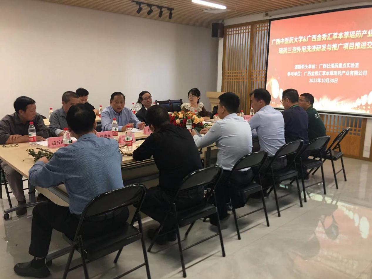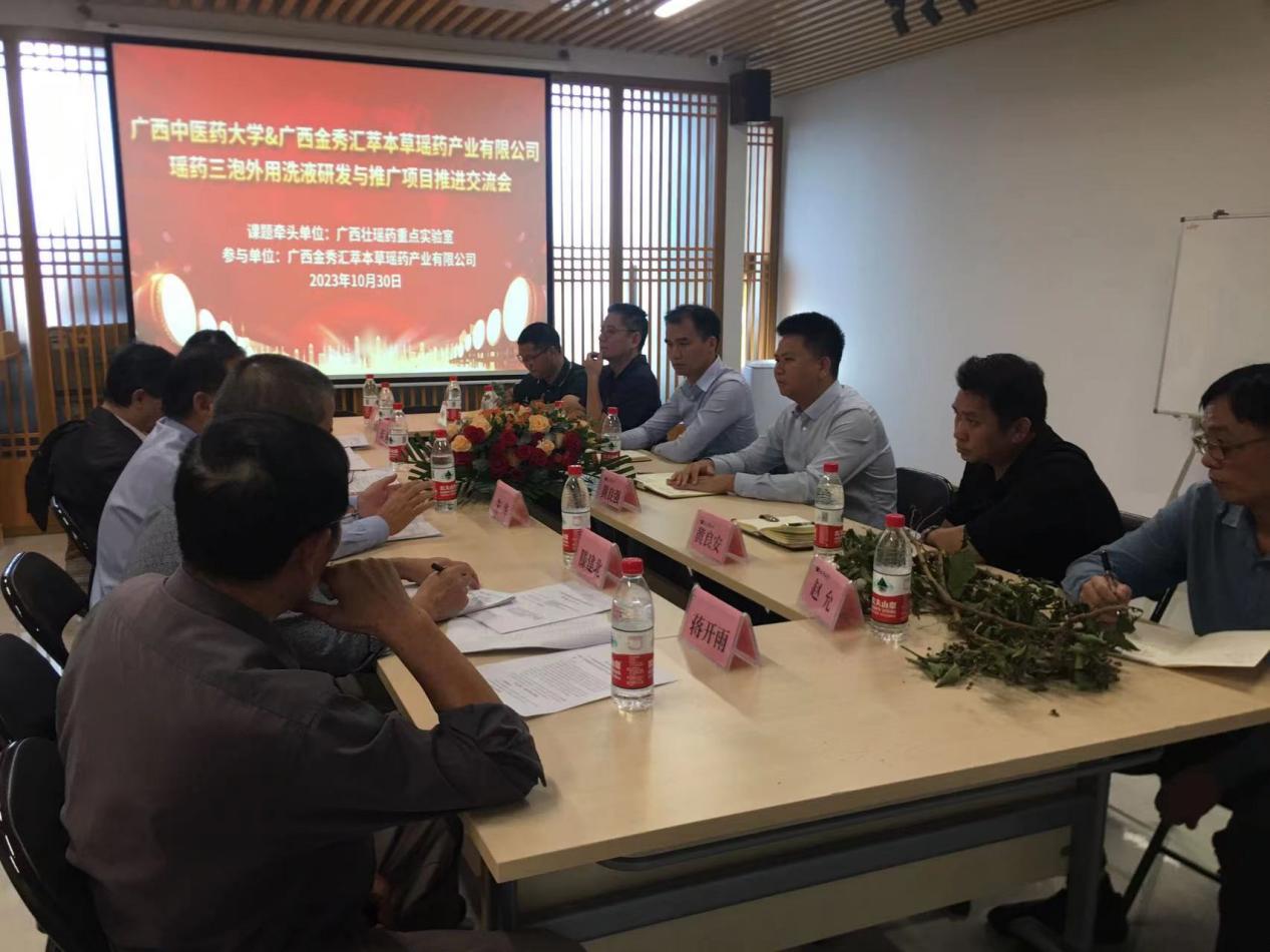为了加强“广西中药民族药产业科技专项—瑶药三泡外用洗液的研发与推广”、广西重点研发计划项目“广西产 5 种壮瑶药材质量标准与产品开发研究”和广西科技基地与人才专项“YABO鸭脖-中南大学壮瑶药研究联合实验室”等项目的产学研合作,推进项目顺利进行,2023年10月30日,我平台主任朱华教授及平台骨干甄汉深教授、谢凤凤博士、张淼老师、蒋开雨老师、余秀琪老师和研究生代表等一行人赴广西金秀汇萃本草瑶药产业有限公司洽谈交流。