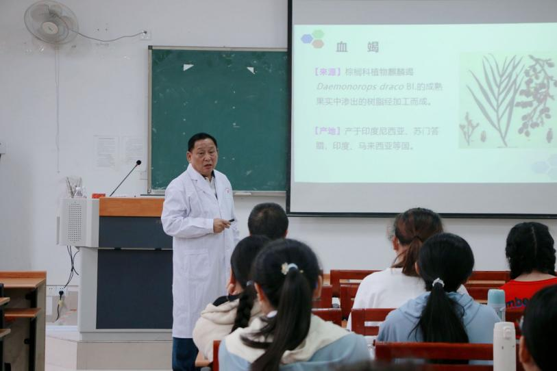 2021年11月12日上午,平台主任朱华教授在教学楼1-302给2019级药学2班全体同学授课。课程开始,朱华教授以中药、壮药、瑶药、天然药等常用名词的基本概念开始了《生药学》课程的讲解,接着对血竭、川贝母、红花、天麻及动物药蛤蚧的来源、形态特征、鉴别方法等方面具体展开介绍,课上还向同学们展示了上述几种药材,引起同学们极大的兴趣。朱华教授还以亲身实例来告诉同学们中药鉴定在实际应用中的重要性,我们在科研工作中要学会运用理化鉴别、现代科学技术等各种手段来评价药材的真假优劣,防止以假冒真、以次充好现象的发生。