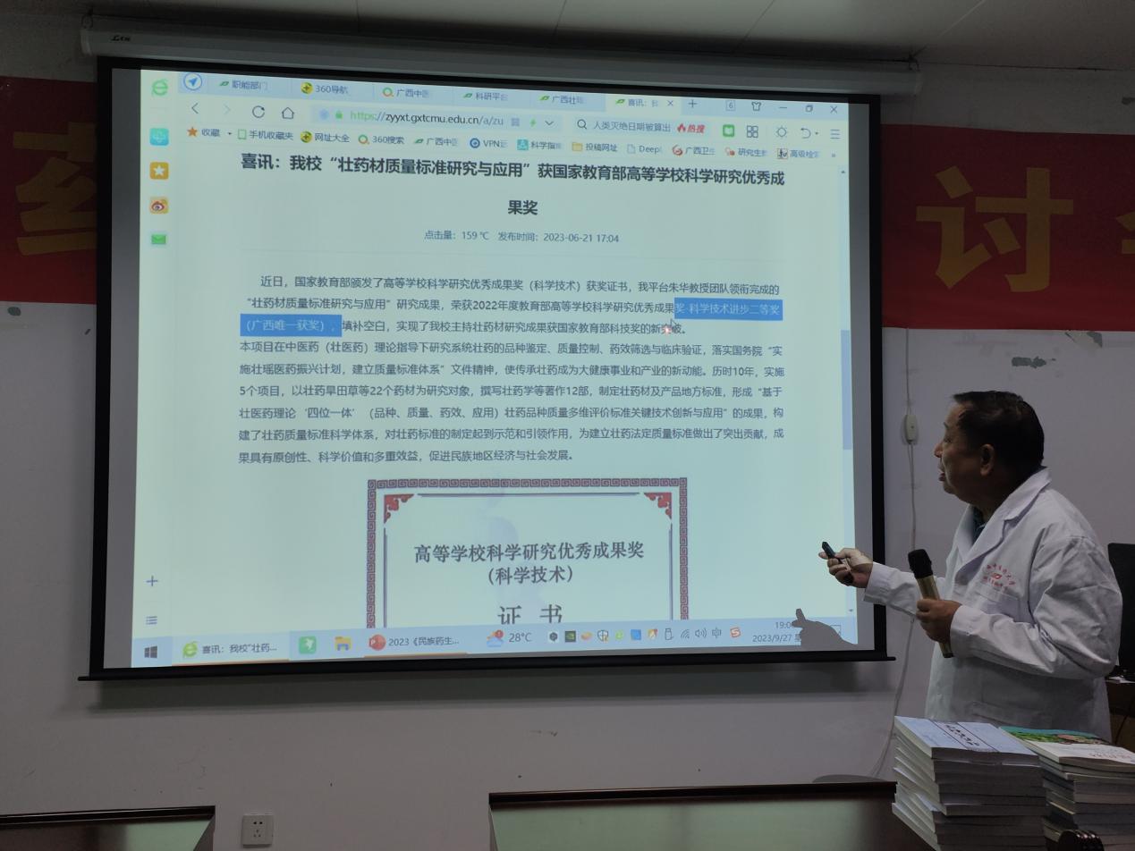 9月27日下午,为了落实国务院“实施壮瑶医药振兴计划,建立质量标准体系”和自治区政府“壮瑶医药振兴计划”的文件精神,营造良好的学术氛围,加强学术交流,拓展学术领域,促进中医药壮瑶医药事业与产业高质量发展,广西壮瑶药重点实验室等召开壮瑶药学术研讨会。主讲人为朱华教授。会上,朱华教授讲解了如何开展研究性学习,一概念性问题研究,何为壮药学?何为瑶药学;二思维性问题,何为科学思维与中医药思维?何为药性理论与现代研究?三战略战术问题,壮瑶医药振兴计划,建立质量标准体系的一大战略与五大突破:理论突破、资源突破、标准突破、产品突破和人才突破;四如何推进中医药壮瑶医药传承创新;五成果转化问题。他还讲述了三联互动(调气、补虚、解毒)的选药原则,四位一体(品种、品质、疗效、应用)的壮瑶药筛选体系、壮医的三道两路及瑶医的盈亏理论、对药食同源的认知等,提出建立完善的质量标准,做好配方配伍及严谨的科学循证研究,是我们的责任。