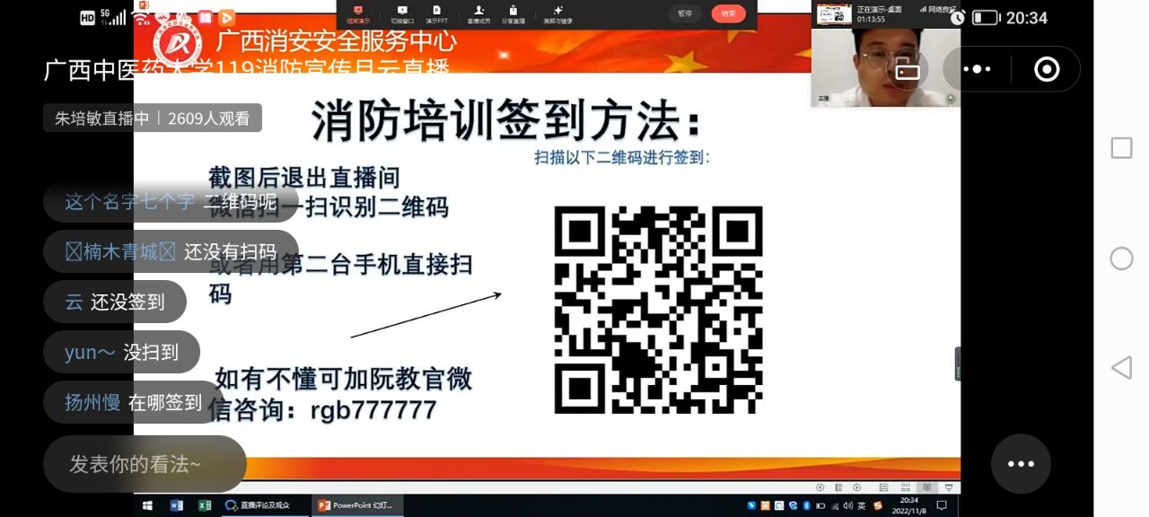 为贯彻落实《中华人民共和国消防法》《高等学校消防安全管理规定》,根据《自治区教育厅关于开展2022年全区教育系统消防宣传月活动的通知》(桂教安稳〔2022〕47号)要求,在全国第31个消防安全日到来之际,本平台(项目团队)师生于2022年11月8日晚、11月9日下午分别组织平台师生员工开展消防安全知识线上培训和灭火器灭火实操演练活动。