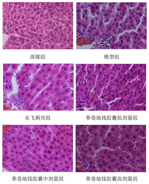 溶媒对照组大鼠肝小叶结构完整,肝细胞索排列整齐,细胞核大而清晰,胞质丰富,汇管区和中央静脉周围无细胞坏死、无炎症细胞浸润等病理变化。模型对照组肝细胞索排列紊乱,汇管区和中央静脉周围细胞大量坏死,炎症细胞浸润明显。与模型对照组比较,水飞蓟宾阳性对照组和拳卷地钱胶囊组肝细胞病理变化状况明显改善,肝小叶结构基本完整,肝细胞坏死和炎性浸润较轻,其中,拳卷地钱胶囊组(200 mg/kg/d)改善最为明显,见图4-10。