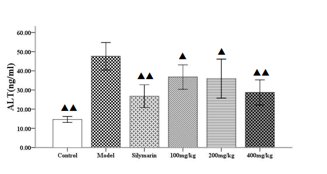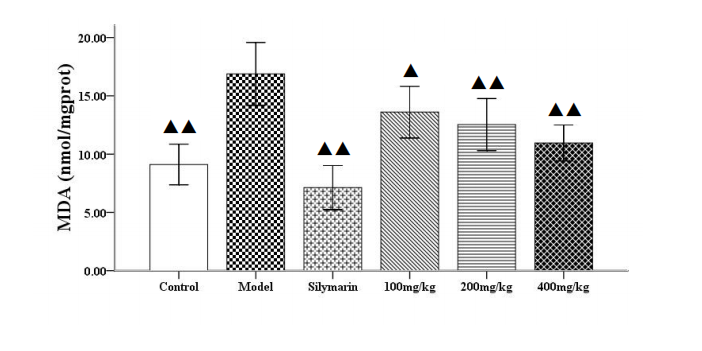 | 水飞蓟宾组 | 44 | 10 | 113.35±20.10▲▲ | 28.14±3.70▲▲ |
