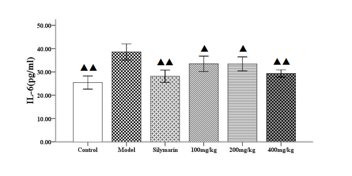 与溶媒组比较,模型组大鼠血清TNF-α和IL-6水平显著升高(P<0.01);与模型组比较,水飞蓟宾组大鼠血清TNF-α和IL-6水平显著降低(P<0.01);拳卷地钱胶囊各剂量组大鼠血清TNF-α和IL-6水平显著降低(P<0.05或P<0.01),详见表4-5,图4-8~图4-9。