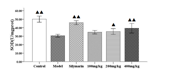 | 水飞蓟宾组 | 44 | 10 | 58.12±6.37▲▲ | 73.85±14.79▲▲ |