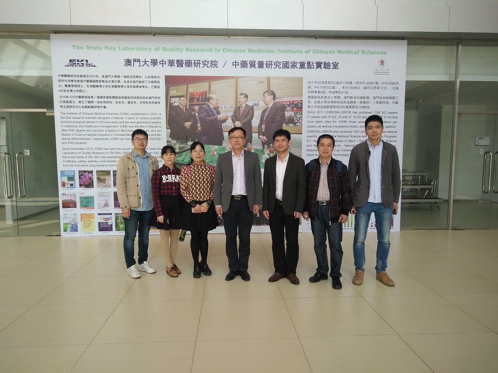学术交流团于28日离开香港赴澳门,并于29日正式访问澳门大学。澳门大学中药质量研究国家重点实验室、中华医药研究院院长助理李鹏博士、余华博士、王胜鹏博士一行接待了出访团。陪同本中心成员先后参观了中药制剂研究实验室、药理实验室、中药质量标准分析实验室、药用植物园和部分专业教学设施。李鹏博士向出访团介绍了澳门大学中药质量研究国家重点实验室的发展沿革、现状及未来的建设方向。苏健博士代表学术交流团向澳门方介绍壮瑶药协同创新中心的情况。双方还就将来师生互访、研究生培养、合作开展项目研究等事宜进行了探讨和交流。
