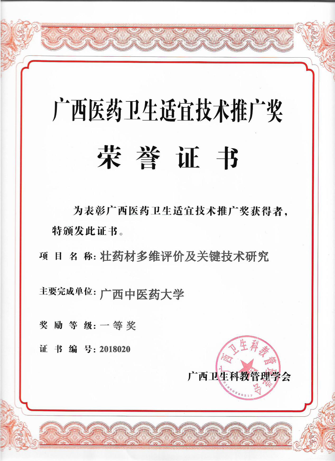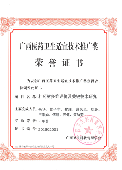 2018年度广西医药卫生适宜技术推广奖公布了评审结果,我团队科研成果《壮药材多维评价及关键技术研究》喜获一等奖,获奖人员名单:朱华、梁子宁、黎理、谢凤凤、蔡毅、王孝勋、傅鹏、苏健、笪舫芳、张淼、陈龙、滕建北、周雨晴、杜沛霖、龙莉。这是我团队继2017年度荣获一等奖后又一佳绩,在鸭脖作为科研团队率先连续2年(2017、2018年)荣获广西医药卫生适宜技术推广奖一等奖,为推动壮瑶医药振兴作出了新贡献。