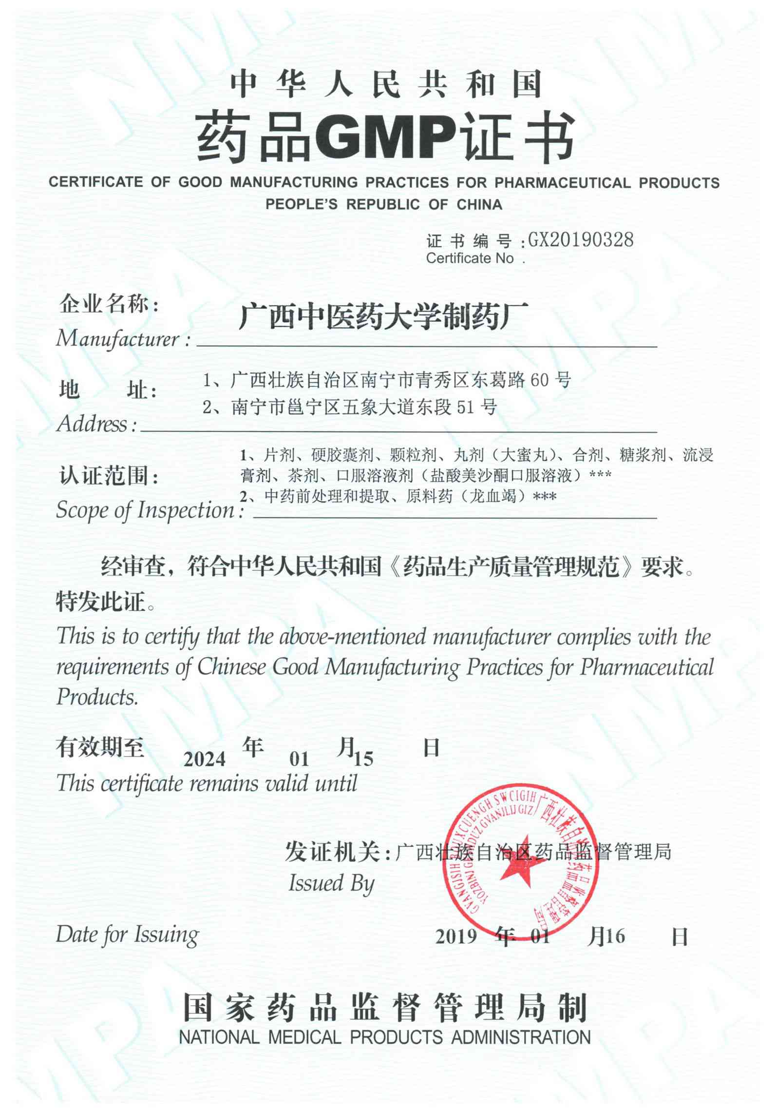 近日,由广西壮族自治区药品监督管理局审评认证中心组织的药品GMP现场检查验收专家组,到鸭脖制药厂进行GMP认证检查,专家组对制药厂化验室、生产车间(片剂、硬胶囊剂、颗粒剂、丸剂(大蜜丸)、合剂、糖浆剂、流浸膏剂、茶剂、口服溶液剂、中药前处理和提取、原料药等)、留样室、制水车间等进行了实地考察验收,并对制药厂职工档案、规章制度、批生产记录、留样记录、生产工艺规程、成品销售记录等资料进行了认真审核查验。专家组本着公正、公平的原则,以认真负责的态度,对照新颁发的《药品生产质量管理规范(2010年修订)》的规定,通过三天时间的全面考察,专家组对制药厂各项工作给予了高度的肯定,制药厂最终以优异的成绩顺利通过了药品GMP认证。