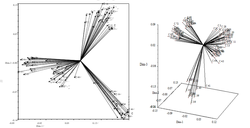 不同产地锡叶藤的主坐标分析:主坐标分析(PCoA)能更直观反应居群的空间距离关系。基于遗传距离及遗传相似度[6],运用 NTSYS-pc 2.1 软件对各居群锡叶藤进行 PCoA 分析,结果见图 7 及图 8 所示。