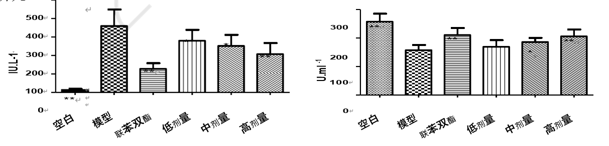 本实验以 CCl4 导致的大鼠急性肝损伤为研究模型,测定血清中 ALT、AST、SOD、MDA 和GSH-Px 活性或含量以及肝匀浆中的 TNF-α、IL-1β和 IL-6 水平,对拳卷地钱总黄酮的保肝效用进行研究[6]。