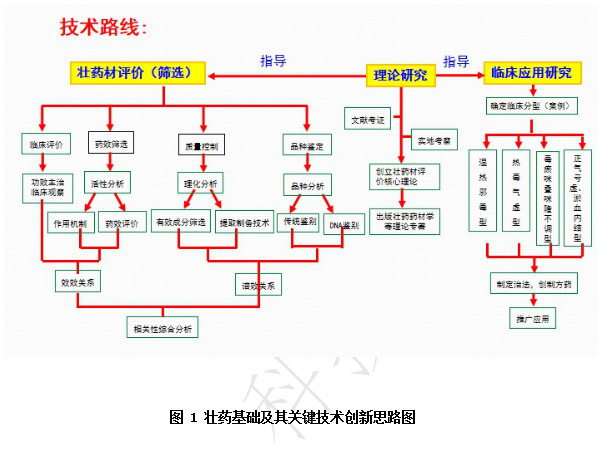 基于壮医药理论指导下的壮药基础及其关键技术创新与应用的总体思路:指导思想为“源于壮医、创新理论、科学求证、结合临床、生产应用”。核心理论“祛邪毒,调咪叠, 通道路,助正气”的壮医治疗原则 ,选药原则为解毒调气补虚 “三联互动”,关键技术创新为四位一体“品-质-效-用”壮药多维评价技术体系。
