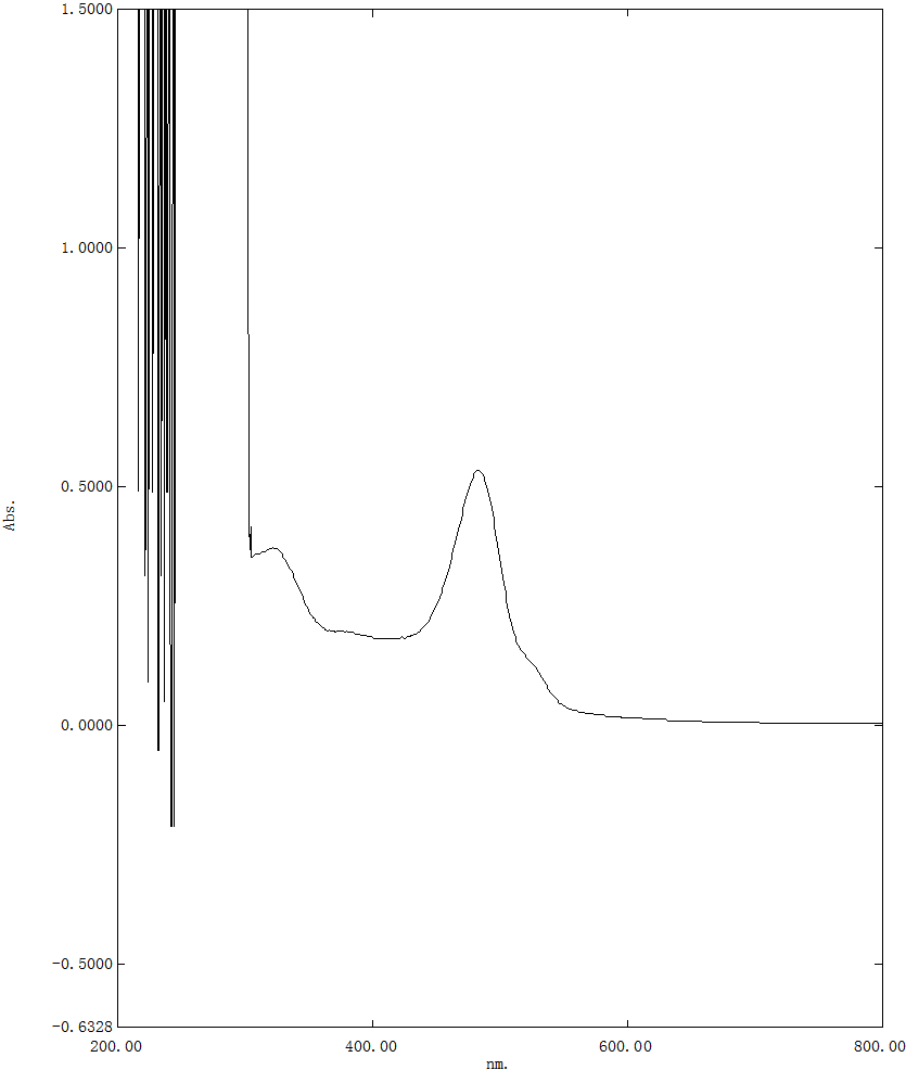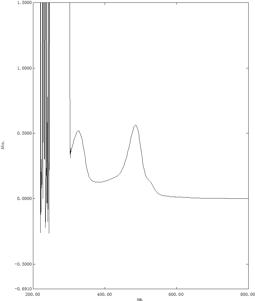分别取对照品溶液、供试品溶液0.5ml和1.0ml置10ml具塞试管,加水补至1ml,加新配置的5%苯酚溶液1ml,摇匀,沿管壁迅速加浓硫酸5ml,摇匀,沸水浴加热20min后置冰水冷却5min,紫外可见光全波长扫描,确定最大吸收波长485nm。见图1。