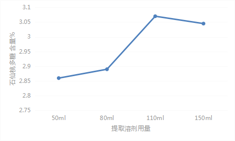 分别取过65目SXT-12药材粉末0.3g,精密称定,分别加蒸馏水50 ml、80 ml、110 ml、140ml,称重,加热回流2h,并按供试品溶液制备方法项下的方法对提取溶液进行处理,按显色方法项下方法进行显色,紫外分光光度计测定吸光度值。结果显示加蒸馏水110ml时,石仙桃多糖提取率最高,故加蒸馏水110ml提取石仙桃多糖。见表5、图4。