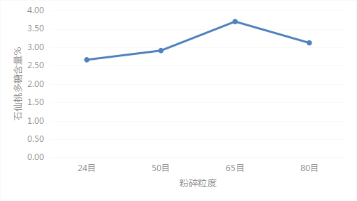 将SXT-12药材粉末分别过24目、50目、65目、80目筛,分别取0.3g,精密称定,加蒸馏水80ml,称重,加热回流2h,并按供试品溶液制备方法项下的方法对提取溶液进行处理,按显色方法项下方法进行显色,紫外分光光度计测定吸光度值。结果显示药材粉碎粒度为65目时,石仙桃多糖提取率最高,故选用粉碎粒度为65目的药材提取石仙桃多糖。见表4、图3。