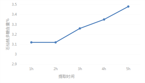 分别取过65目SXT-12药材粉末0.3g,精密称定,加蒸馏水110ml,称重,分别加热回流1.0h、2.0h、3.0h、4.0h、5.0h,并按供试品溶液制备方法项下的方法对提取溶液进行处理,按显色方法项下方法进行显色,紫外分光光度计测定吸光度值。结果显示提取时间为5h时,石仙桃多糖提取率最高,故选用提取时间5h提取石仙桃多糖。见表6、图5。