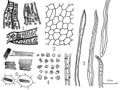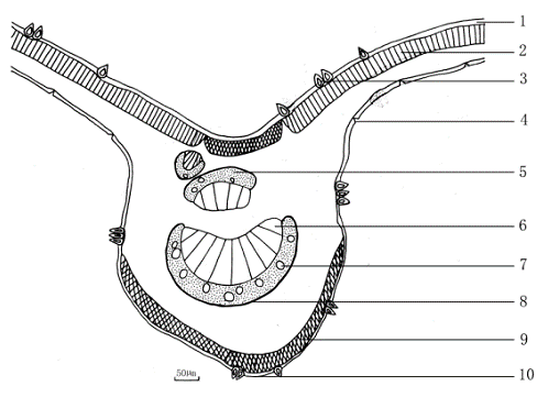 3.3叶横切面 上、下表皮细胞均为1列,上表皮细胞较大,多类方形或长方形,排列紧密,外被角质层。下表皮细胞较小,类圆形,排列紧密,见气孔。上、下表皮均嵌生高度硅质化的非腺毛。栅栏组织细胞1列,细胞短柱状,延伸至主脉上方,但不连接主脉。海绵组织疏松,细胞呈环状排列,细胞间隙大。主脉维管束2-4个,外韧型,散在。韧皮部外围有纤维和厚壁细胞相间排列成环,内含单个散在的粘液细胞。主脉上、下内侧均有厚角组织。(图4、图5)